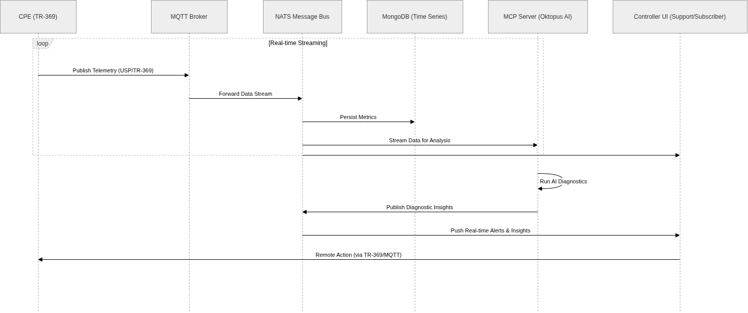 Oktopus architecture streams real time telemetry data from the CPE to the microservices responsible to handle diagnostics, alerts, QoE/QoS analysis, and management UI.
